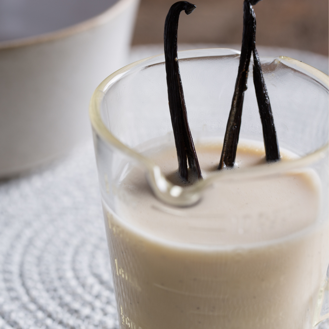 - Calienta la leche y mezcla con la vainilla y el endulzante.